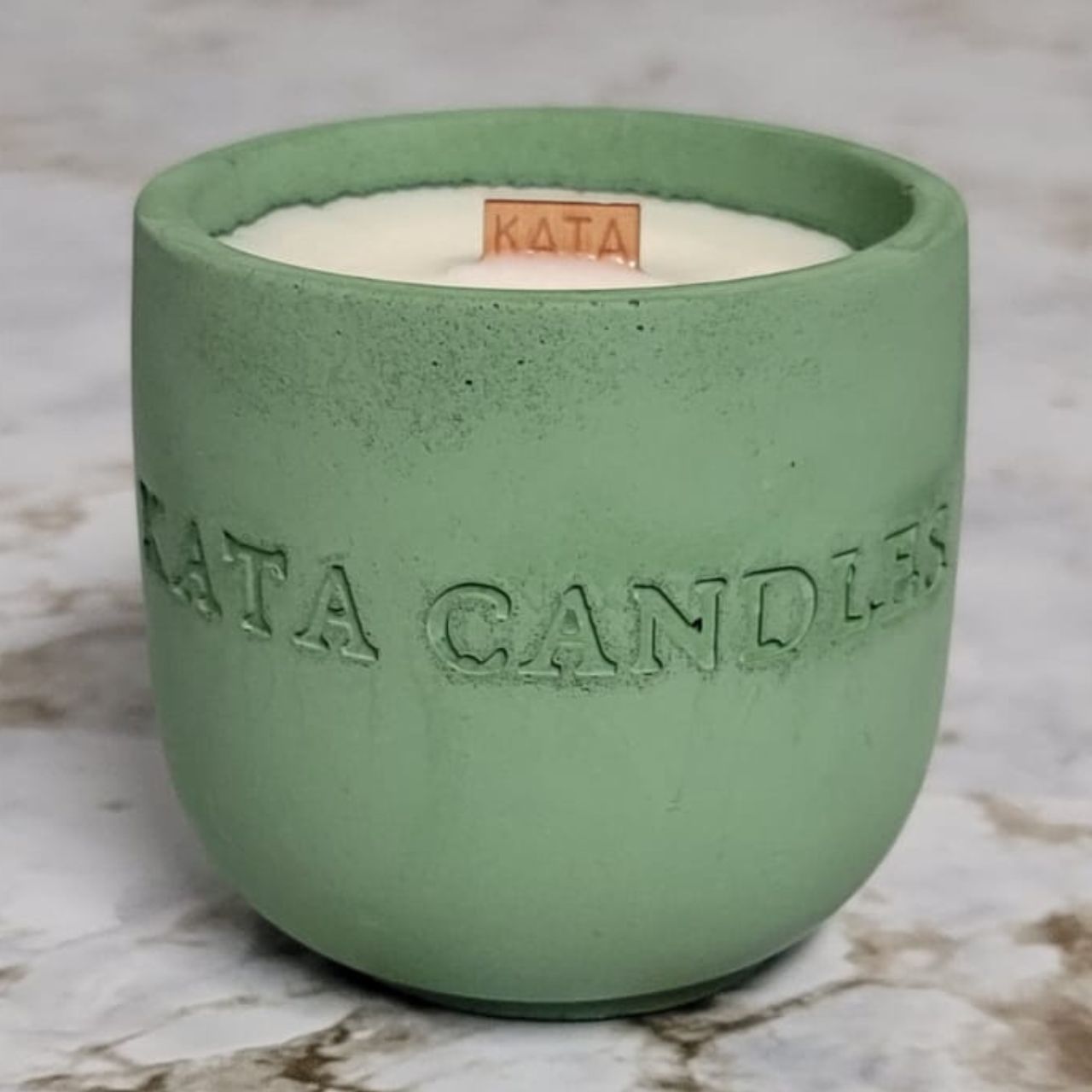 - Materials: Soy Wax, Wood Wick, Handmade Concrete Vessel Color Green, Natural Fragrance Oil